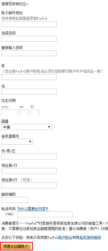 进入PayPal注册页面,根据网页提示创建PayPal账户信息,请使用拼音填写,填好后点击“同意并创建”。由于部分国外商城是不支持汉字显示的,所以如果使用全中文注册会在购物时造成很多不必要的麻烦,在这里建议在填写信息时使用汉语拼音。