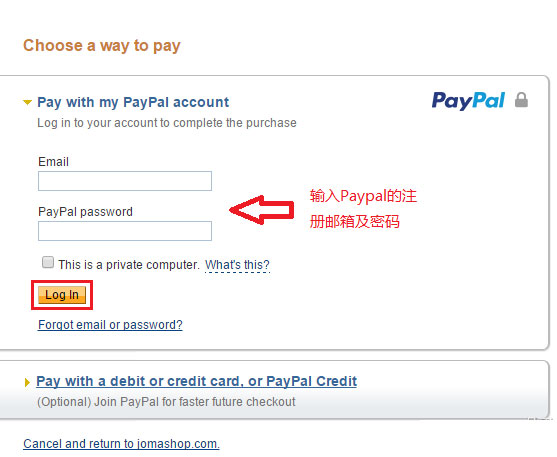 2.登入Paypal,填写PayPal账号及密码,然后点击“Log In”。