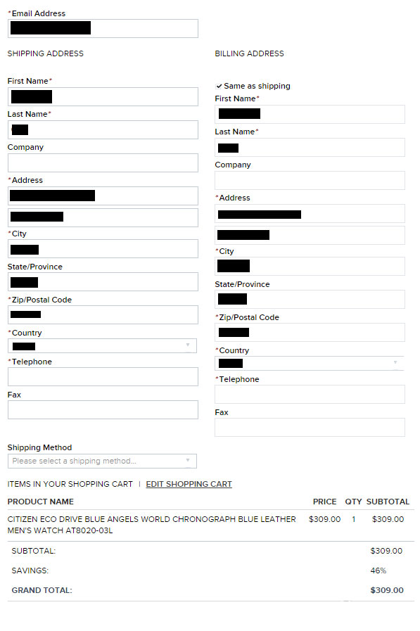 4.点击“继续”后会跳转回Jomashop的界面,再次还可以最终修改送货地址已经账单地址,以及快递方式,所有确认无误后点击“Place Order”。