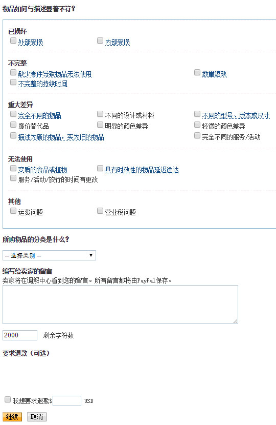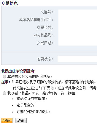 点击“继续”之后,选择争议原因,在这里我们选择第二项。