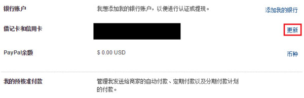 我们可以看到目前使用的信用卡/借记卡,然后点击“更新”。
