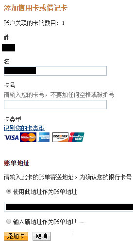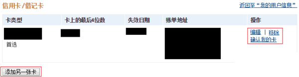 添加新的卡号和修改账单地址(这里默认的是注册时使用的地址,当然也可以输入一个新的账单地址)。