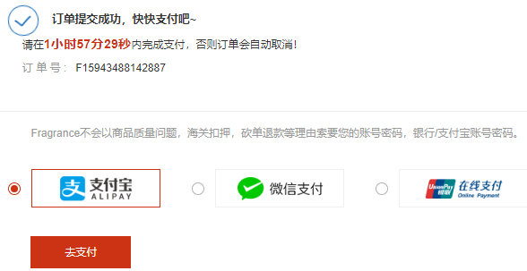 6、确认提交订单后进入付款页面,支持支付宝、微信以及银联支付;