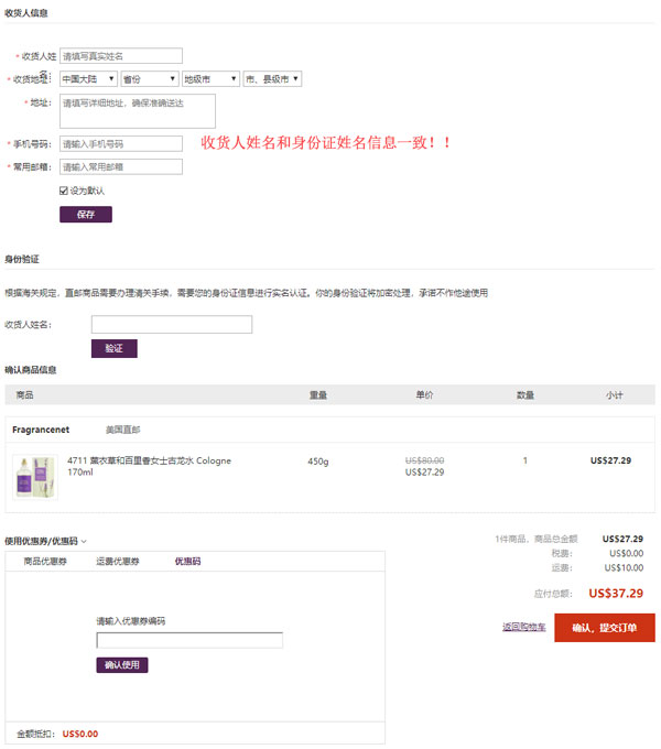 5、点击去结算进入填写收货地址页面,这里以直邮为例(含税费);