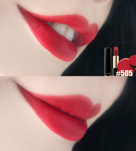 兰蔻菁纯丝绒雾面哑光唇膏口红磨砂壳包装超级有质感,505薄涂是水红色,厚涂超正朱砂红,颜色超适合秋冬,超高级超显白。不挑肤色黄皮也无压力,整体色调偏暖,饱和度很高,虽然是哑光质地但是不会拔干,涂起来膏体顺滑好推开。