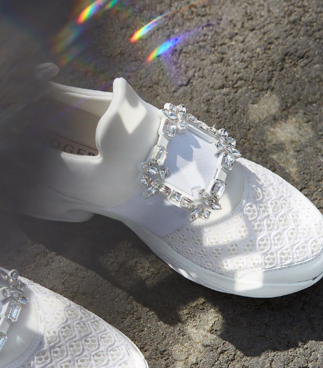 Roger Vivier 的 Viv' Run 运动鞋的灵感来自该品牌的传统元素,从标志性的 Strass 搭扣到厚实的 Choc 鞋跟。该设计采用厚橡胶鞋底和白色科技面料鞋面,点缀有交叉影线网眼。鞋面镶有水钻装饰;