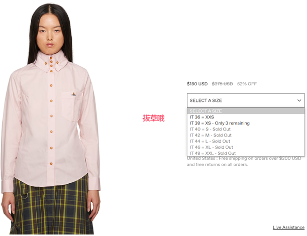ssense的这款Vivienne Westwood Krall西太后基款础粉色衬衫,邮寄美国售价48折$180 。36、38码有货。