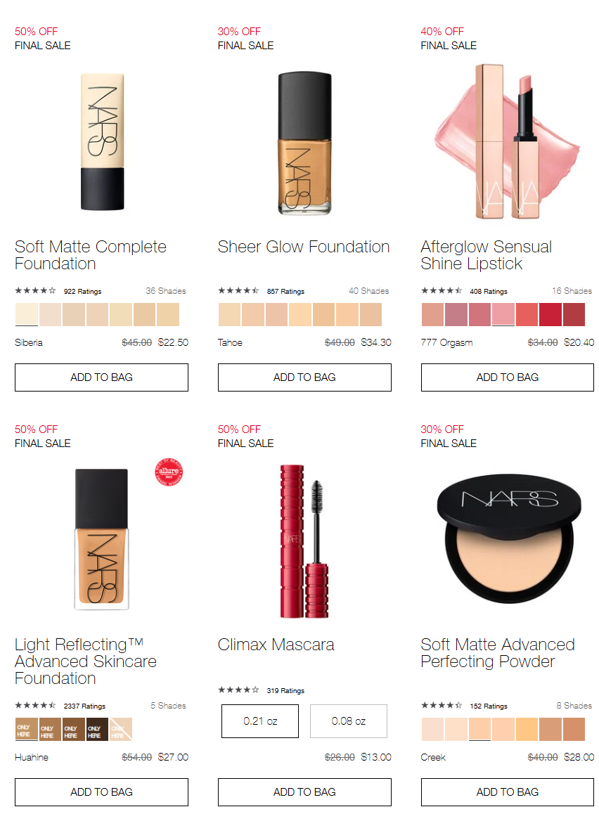 友情提示: "NARS官网 折扣区上新 低至5折 新增多款套装"商品及优惠信息(超方瓶$27 限定大白饼$20)来自合作商家,具有时效性和地域性, 折扣信息及商品价格会随时变化,请各位网友购买时注意核实,以商家实时信息及商品价格为准,本站不承担任何形式的责任。