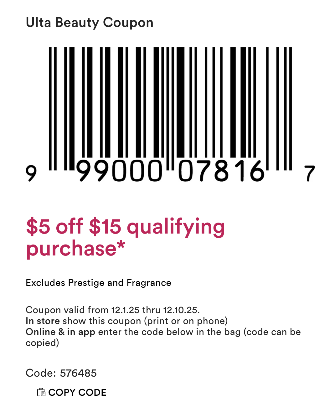 此外,还有满$15减$5的优惠码576485,有效期为12月1日至12月5日,(点击这里)前往(优惠码页面)获取适用于线下门店的优惠码,但不包含高端品牌和香水。