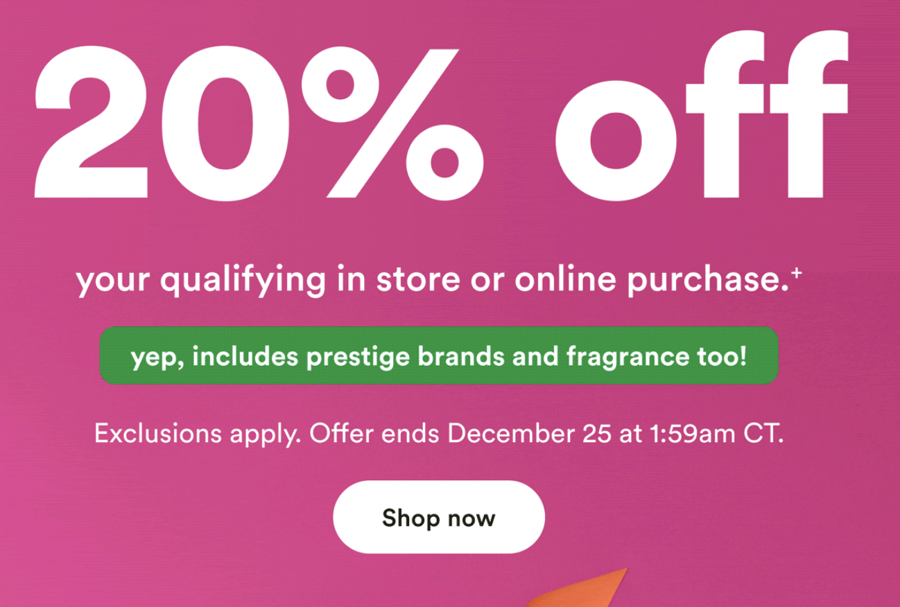 快去查看你的Ulta邮箱或App,看看是否收到了全场8折的独特优惠码(包括高端品牌和香水),活动截止至12月25日。