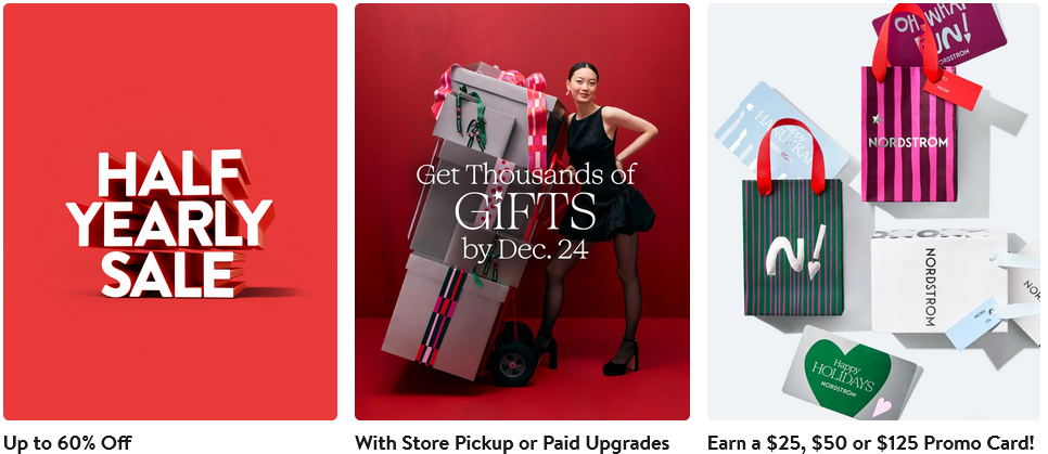 *如需了解店内优惠限制,请咨询任意销售人员。要参与此线上优惠,必须在2025年12月17日晚上9:01(太平洋时间)至2025年12月25日晚上11:59(太平洋时间)期间,在Nordstrom.com、NordstromRack.com或Nordstrom及Nordstrom Rack移动应用上单笔交易中购买数字或实体礼品卡(“礼品卡”)。单笔交易中累计购买$150 USD礼品卡可获得$25 USD促销卡;累计购买$250 USD礼品卡可获得$50 USD促销卡;累计购买$500 USD礼品卡可获得$125 USD促销卡。每位顾客在促销期内仅限获得一张促销卡。线上优惠不适用于Nordstrom实体店、Nordstrom Rack实体店或Nordstrom Local。促销卡将于2026年1月6日左右发送至符合条件的购买时提供的邮箱地址。促销卡有效期至2026年2月6日晚上11:59(太平洋时间)。促销卡可在Nordstrom实体店、Nordstrom Rack实体店、Nordstrom Local、Nordstrom.com、NordstromRack.com以及Nordstrom和Nordstrom Rack移动应用中使用。促销卡不可充值、兑换现金(除非法律要求)或用于支付账户。仅可按面值全额使用。促销卡不可用于购买实体或数字礼品卡,也不可用于之前的购买。促销卡不可购买、出售、交易或转让。使用促销卡即表示接受其条款。Nordstrom及其附属公司员工不享有此优惠。优惠可能会随时修改、取消或延期。